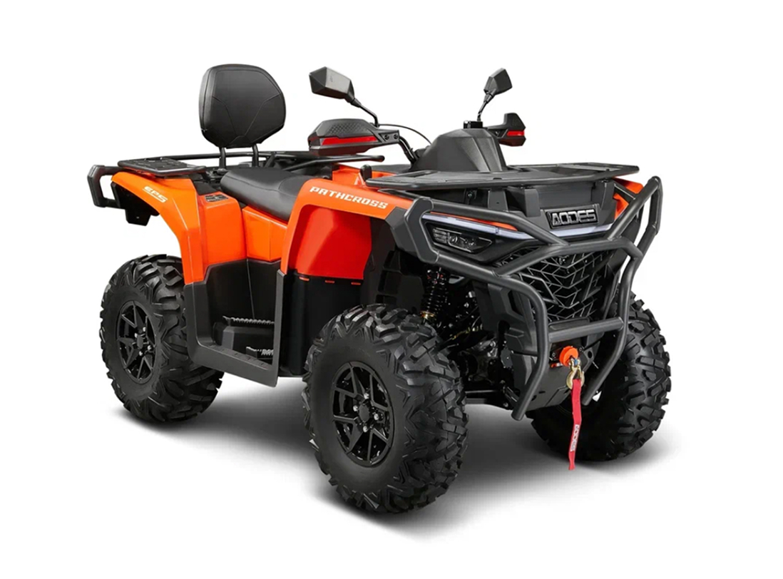 Двухместный утилитарный квадроцикл AODES Pathcross с двигателем 580 см³, 27″ резиной, усилителем руля и цифровым дисплеем.